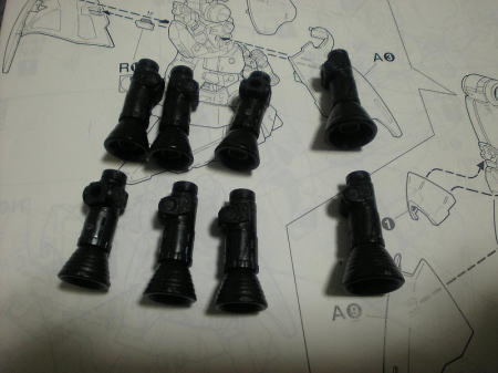 両手が完成しました。MGは指が稼動します。稼動は結構なのですが武器を握るときにどうも握力が弱くこれは多分オモシロポーズをさせるために稼動式になっているのではないのかな!と。